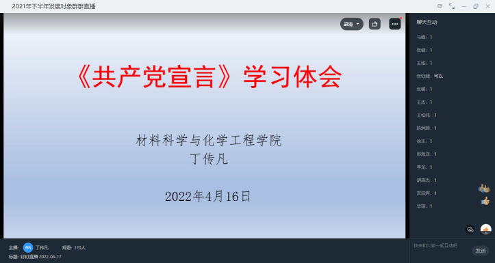 特聘院长丁传凡以线上方式主讲《共产党宣言》专题党课,学院共140余名同学参加。