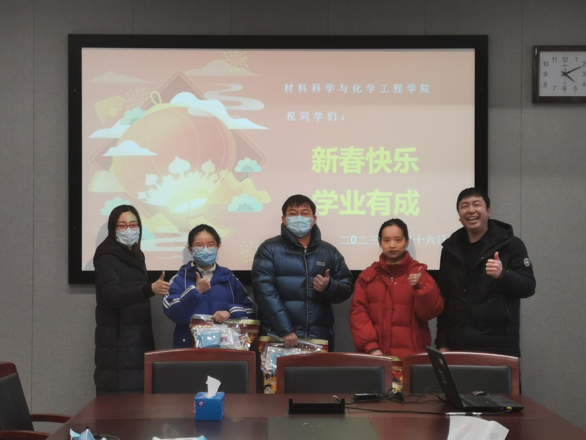 1月16日,材料科学与化学工程学院举行2023年春节留校学生座谈会。学院党委副书记、留校辅导员和学院教师代表一同参加慰问,为学院春节留校学生送上新年礼包和新春祝福,表达学院的殷殷关怀。