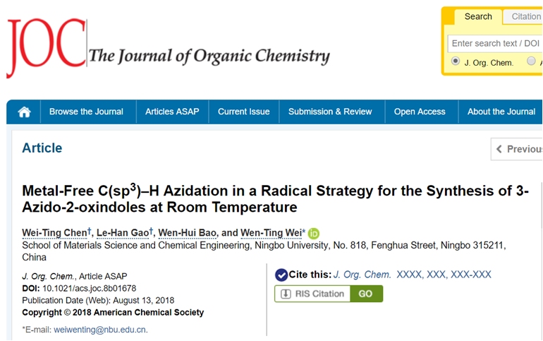 2015级本科生陈伟婷在美国化学会旗下TOP期刊Journal of Organic Chemistry上以第一作者发表了题为“Metal-Free C(sp3)-H Azidation in a Radical Strategy for the Synthesis of 3-Azido-2-oxindoles at Room Temperature”的研究论文(DOI: 10.1021/acs.joc.8b01678),台湾三级片