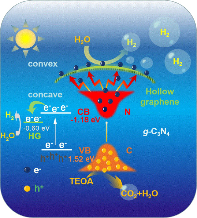 该研究通过真空填充热聚合,将g-C3N4原位生长在中空石墨烯(g-C3N4@ HG)中,用于光催化H2O解离生成H2。实验和理论计算表明,三维中空石墨烯腔内外电场促使g-C3N4 光生载流电子从其经石墨烯内腔定向迁移至石墨烯外表面活性位。与贵金属产氢催化剂相比,在太阳光光照射下且无需任何金属组分作为助催化剂的情况下,g-C3N4@HG展现了绝对优势的产氢效率,这些研究结果在太阳能光催化氢燃料合成领域的中提供了一种新的光生载流子转移和利用策略。