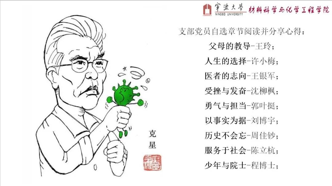 2020年度首次蔚蓝书香党员读书会暨疫情志愿者微党课主题党日活动在钉钉网络平台顺利举行。活动由材料工程研究生第一党支部承办,学院副书记,学工办主任,指导老师和材料工程研究生第一党支部、化学研究生第一党支部全体党员参加。
