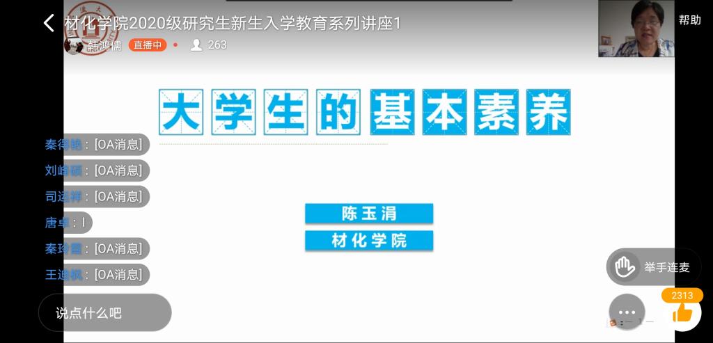 全体院领导以分管业务为导向,通过钉钉视频课堂联播,分四场给全体研究生新生开展专题讲座,一千多人次观看直播,收获点赞超万。
