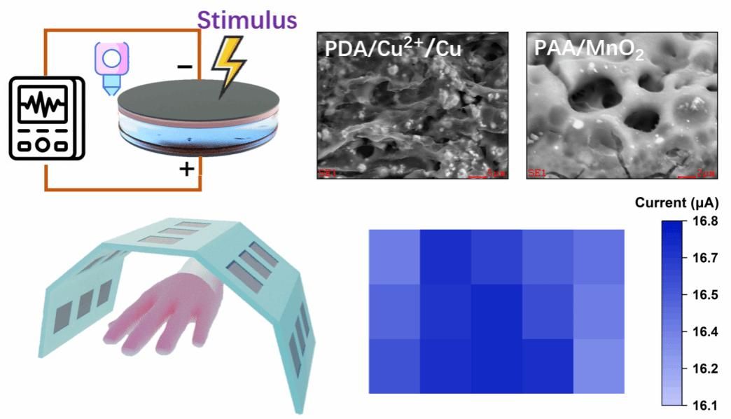 柔性传感器在健康与人机交互等方面具有不可替代的应用。当前虽然已开发出多种类型的柔性传感器,但是目前的很多柔性传感器都需要整合外部电源。这已成为柔性传感器发展的重要瓶颈。为解决这个问题,一种常见的、较为成熟的方法是将光伏电池等做成非常规的几何形状,以实现薄型、可弯曲和可拉伸的设计,其生产过程需要用到微加工技术,能耗较高,步骤多,因而发展受到限制。此外,压电材料、热电材料等也被用来构筑自供能柔性传感器。这类自供能设计能避免刚性供电器件整合的问题,但是这类传感器往往只能对某一刺激,比如压力,产生响应。近年来,原电池型自供能柔性传感器也得到了一定的发展。这类柔性传感器利用电解质材料的精心设计与电极反应可实现对多种刺激信号的响应。但是基于原电池的柔性自供能传感器在成型制造方面仍较为繁琐,且在无接触动作传感等方面的应用也鲜有报道。