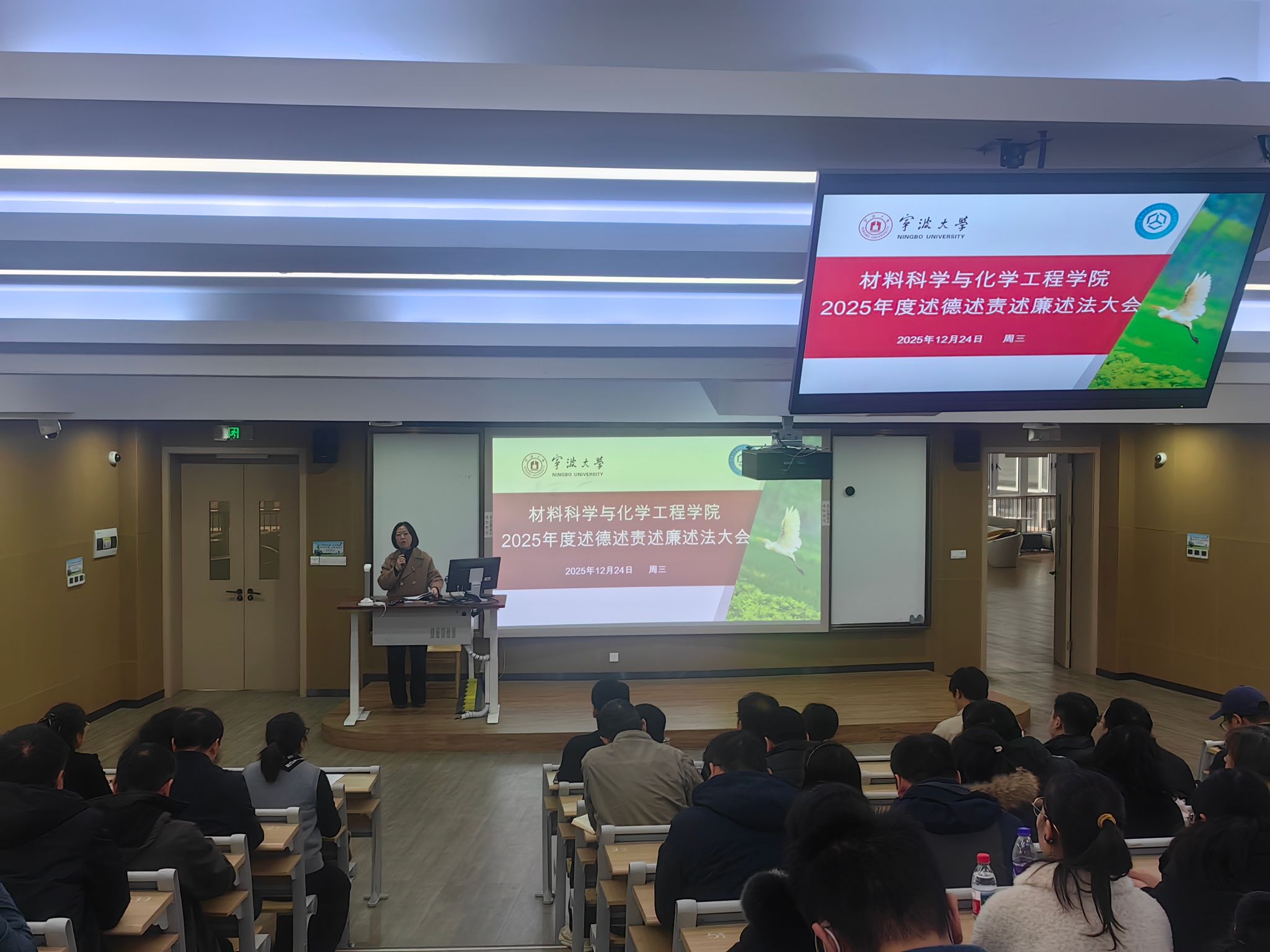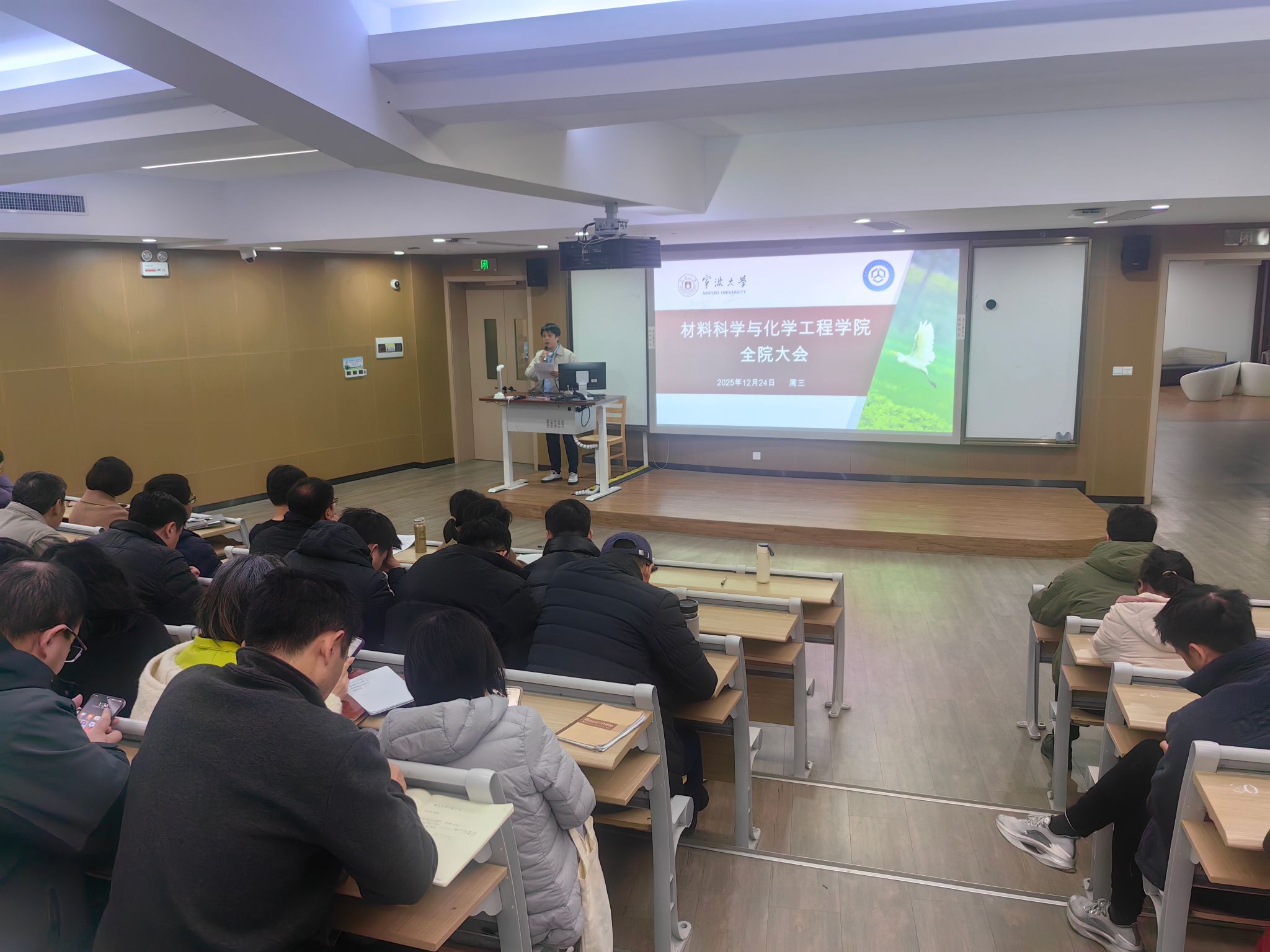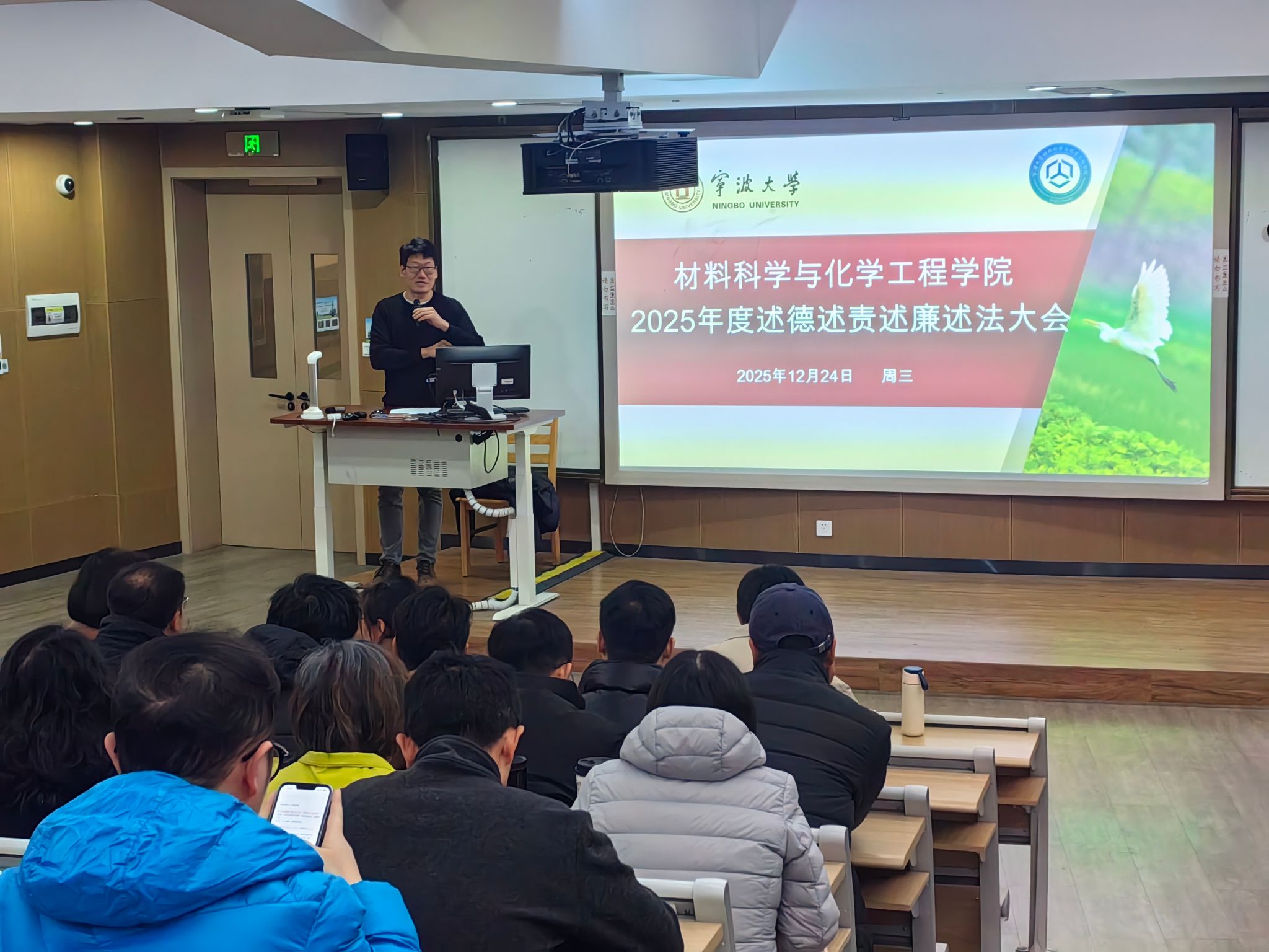 院长李砚硕代表班子对学院年度工作进行了回顾,提出下一年度工作思路和目标。他表示,2025年度,在全体材化教师的共同努力下,学院取得了多项标志性业绩;并通报了下一阶段工作思路,要求全体教职工要深刻认识“十五五”规划的重大意义,打好博士点申报的“决胜之战”,同时提醒严守纪律,筑牢学院事业发展的财务保障。随后,党委书记和院长分别进行了个人的述德述责述廉述法报告。