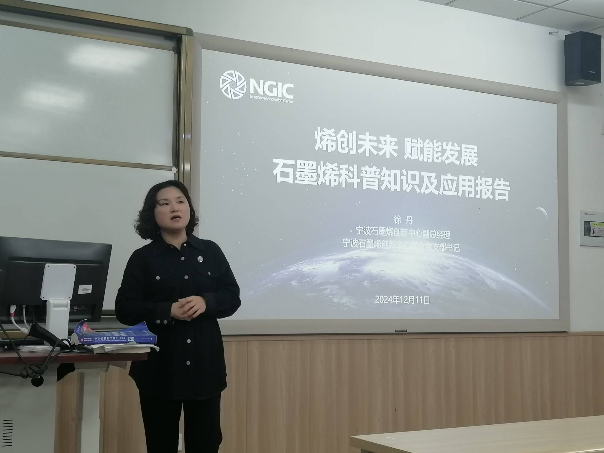 在报告中,徐丹女士还分享了宁波石墨烯创新中心的最新研发成果,向同学们展示了石墨烯在智能纺织品、导电材料、热管理材料等领域的具体应用实例。她强调,石墨烯产业的发展离不开科技创新和产学研合作,鼓励同学们珍惜在校学习机会,不断提高自己的专业素养和创新能力,为石墨烯产业未来发展贡献自己的力量。