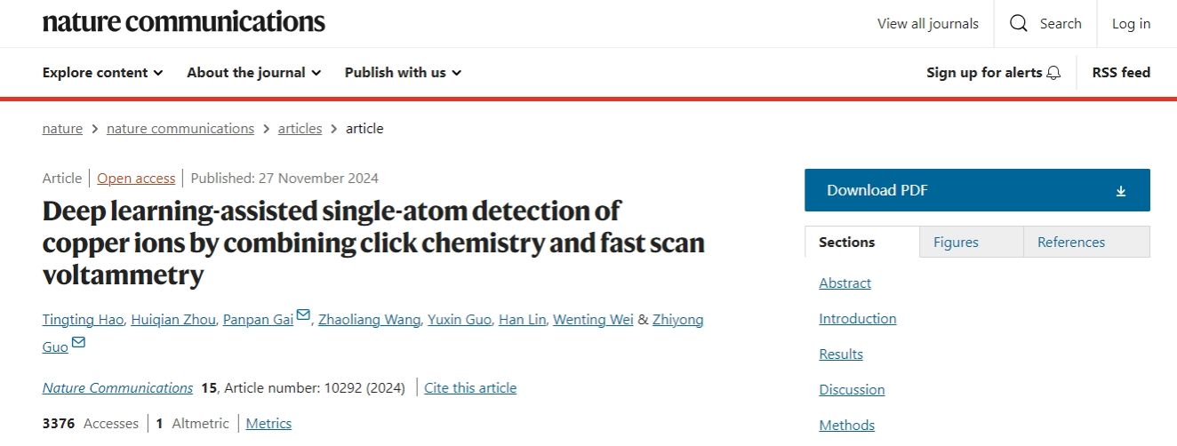 文章:Tingting Hao, Huiqian Zhou, Panpan Gai*, Zhaoliang Wang, Yuxin Guo, Han Lin, Wenting Wei, Zhiyong Guo*, Deep learning-assisted single-atom detection of copper ions by combining click chemistry and fast scan voltammetry. Nat. Commun., 2024, 15: 10292.