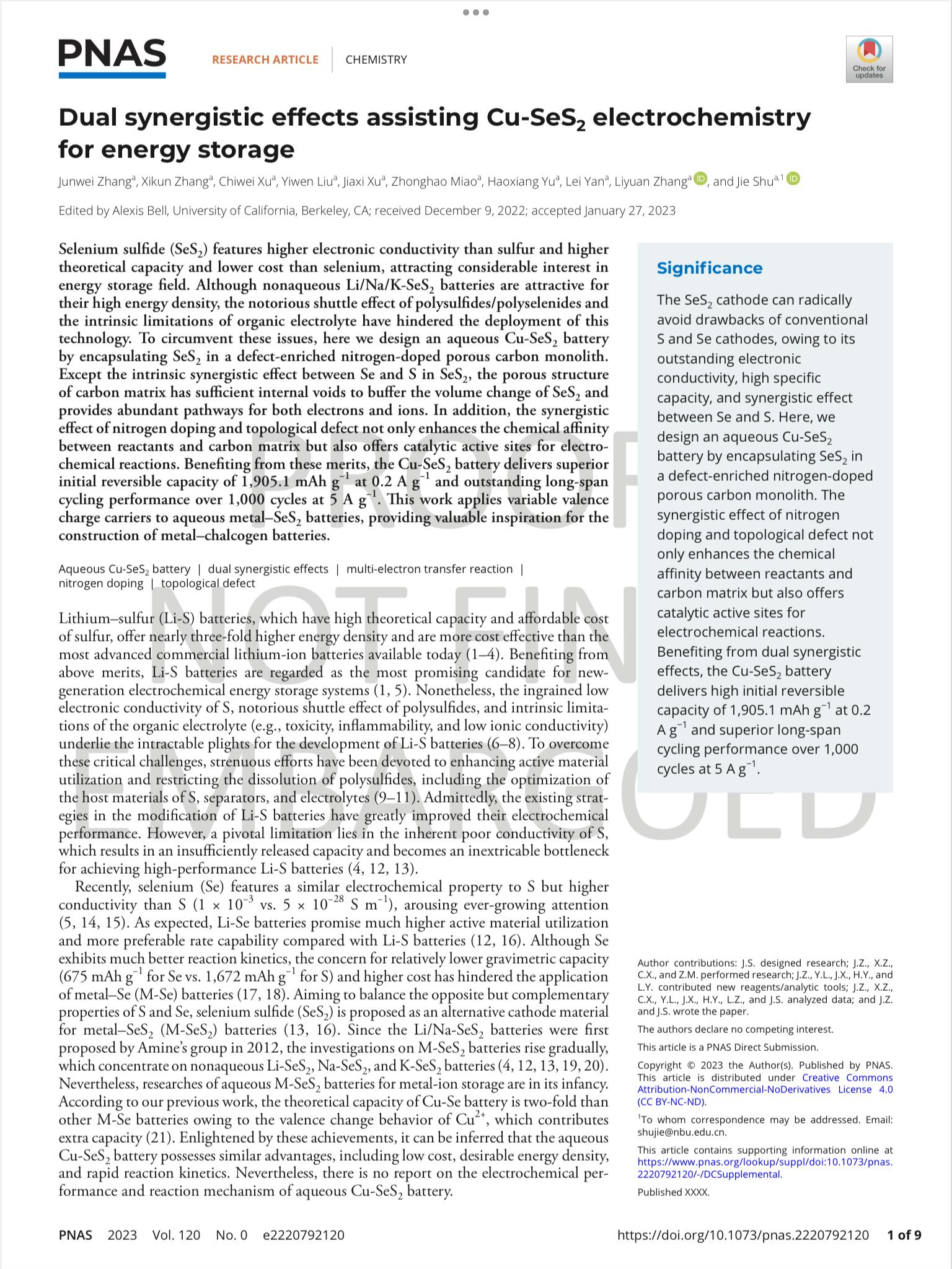 近日,台湾三级片 能源化学团队针对水系硫族电池中的关键科学问题开展了前瞻性的研究,利用双协同作用提升了电极材料的可逆转化能力,进而构建了高性能的水系柔性电池,相关结果发表在美国科学院院刊PNAS上,台湾三级片 是论文的唯一署名单位,硕士生张俊伟为第一作者,舒杰教授为通讯作者。