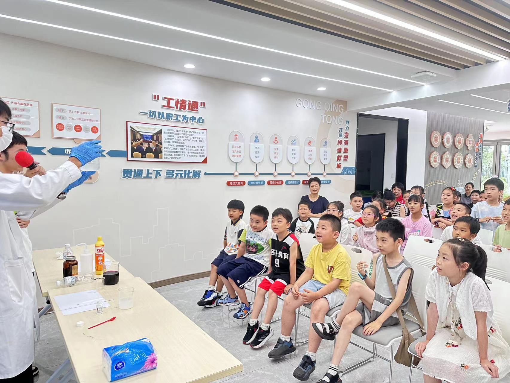 在夏令营的科普实验情景秀环节,科普实践的成员们为宁波市社会福利院和启运社区的孩子们精心设计了一系列寓教于乐的科普实验。成员们从生活中的化学引入,激发小朋友们对于科学的探索精神,帮助他们掌握了更多实用的生活小技能;从“荧光魔法”到“颜色变变变”,再到“大象牙膏”实验,绚丽多彩的化学实验现象吸引着孩子们的目光,成员们为小朋友们耐心地讲解实验原理