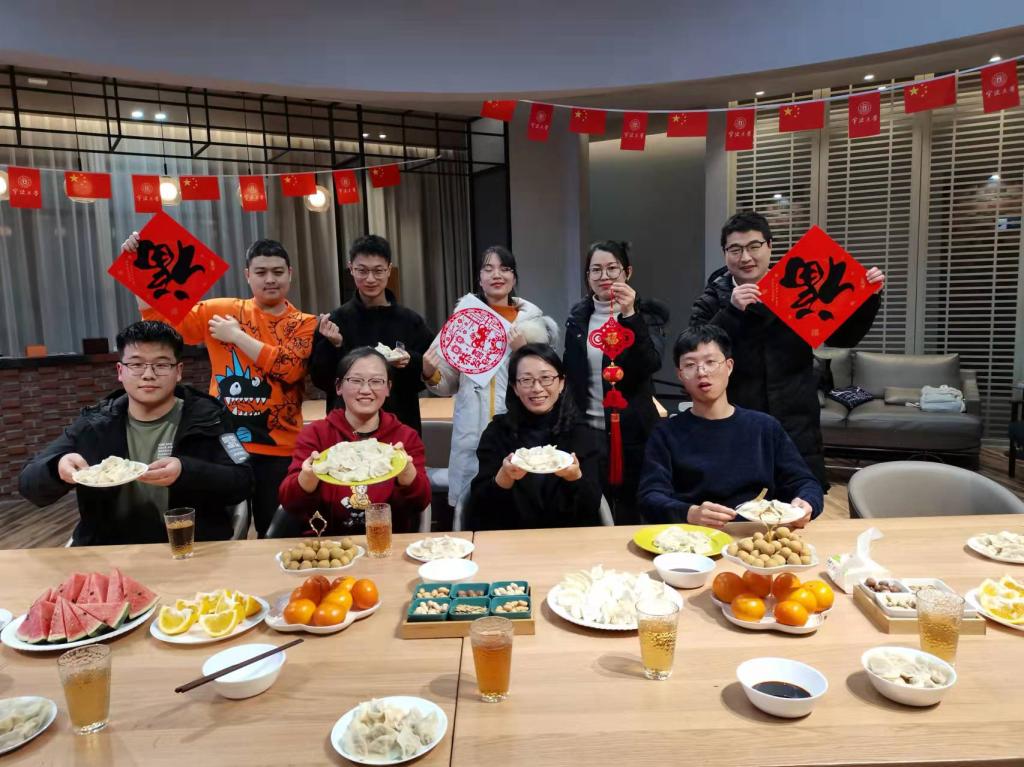 下午3点多,近10名同学在校友之家一起调馅、包饺子,来自全国多地的留校生们一边包着饺子一边分享自己家乡的花式包饺子,有寓意吉祥如意胖乎乎的元宝饺子,有寓意花好月圆弯弯的月牙饺子,还有寓意福、禄、寿、喜的四喜饺子......随着煮锅热气升腾,一盘盘饺子趁着热气下到锅里,在同学们的欢声笑语中,不一会儿,热腾腾的饺子被端了上来,同学们吃着自己亲手包的饺子格外开心。来自河南的王松珠同学说:“虽然不能回家,但是我们能在一起包饺子过小年,就像在家一样,很有年味,第一次吃到西红柿鸡蛋馅饺子也好惊喜。”来自陕西的李宏伟同学拍了自己包饺子的视频,发给家里的爸妈,分享留校过年吃到自己包的饺子的喜悦。