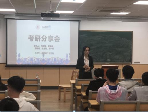 学生会在6号楼101教室组织“考研分享会”。分享会由冉丽军、郭一帆、王金钊、施格格、夏康威5位2021届优秀的考研学子担任主讲。院党委副书记朱燕出席,40余位大三学生参加本次分享会。