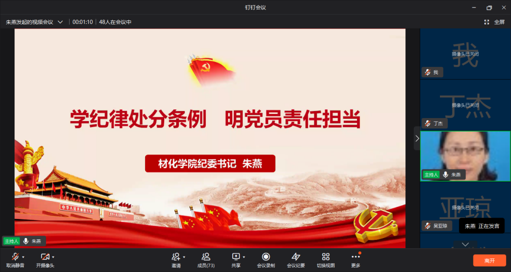 院党委副书记朱燕强调了意识形态的极端重要性,分析了意识形态对社会变革的重要影响和意识形态工作面临的风险、挑战,介绍了我校对校院两级意识形态工作的要求和做法,最后结合近期疫情封校期间,提出如何提升大学生网络意识形态素养。