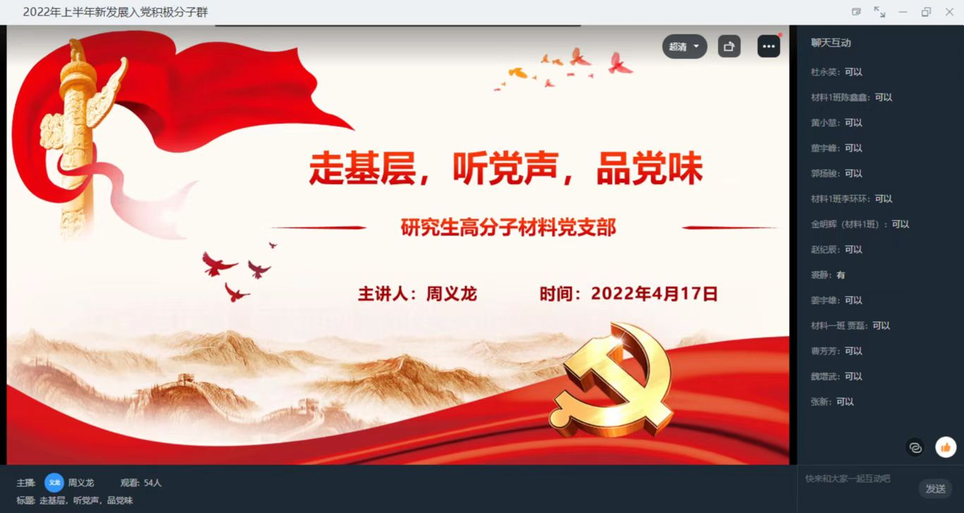研究生高分子材料党支部书记周义龙分享自己团队在2021年暑期社会实践的经历,以基层老党员们的故事,带领学员品“党味”之苦、党味”之辣和“党味”之甜,让学员们坚“前行之心”,明“前行之路”,添“前行之志”。